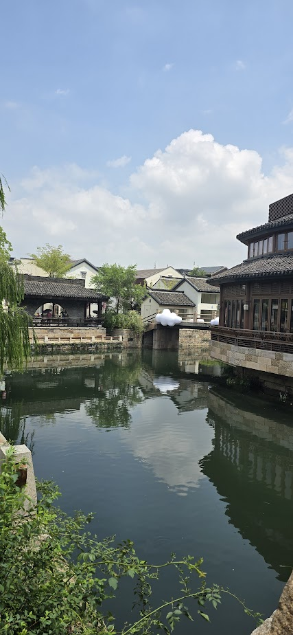 - 강남 수향(水鄕) 스타일: 흰 벽과 검은 기와, 좁은 수로를 가로지르는 아치형 돌다리, 그리고 강변을 따라 늘어선 전통 가옥들이 전형적인 강남(江南) 지역의 고풍스러운 아름다움을 보여줍니다.