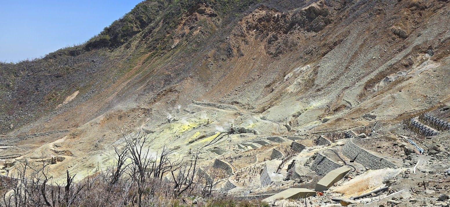 푸른 숲과 대비되어 유독 황량하고 황색빛을 띠는 오와쿠다니 지열 지대는 마치 다른 행성에 온 것 같은 착각을 불러일으켰습니다. 땅 여기저기에서 쉴 새 없이 솟아오르는 유황 가스와 수증기는 지구 내부의 에너지가 얼마나 강렬한지 피부로 느끼게 해줍니다. 이 때문에 로프웨이 내부에는 유황 가스의 위험성을 알리는 안내문과 함께, 천식이나 심장 질환이 있는 사람, 임산부 등은 방문에 주의해야 한다는 경고 문구가 붙어 있습니다. 실제로 로프웨이 역에 내리자마자 톡 쏘는 듯한 유황(Sulfur, 황) 냄새가 코를 찔렀는데, 이게 바로 오와쿠다니의 살아있는 숨결이겠죠.
