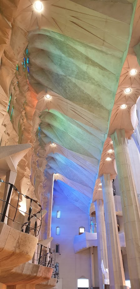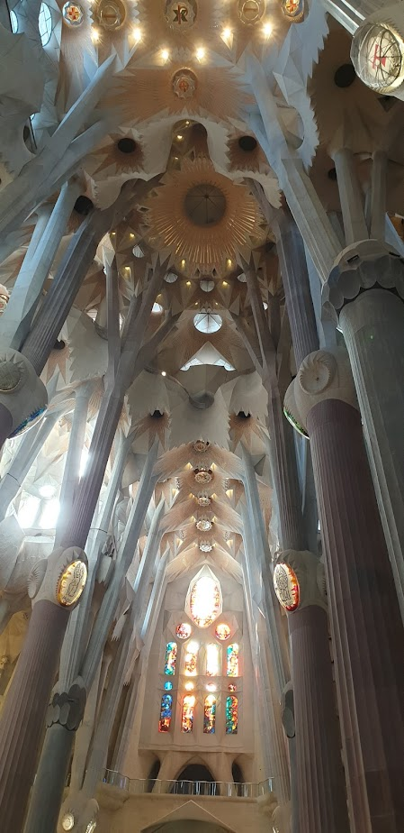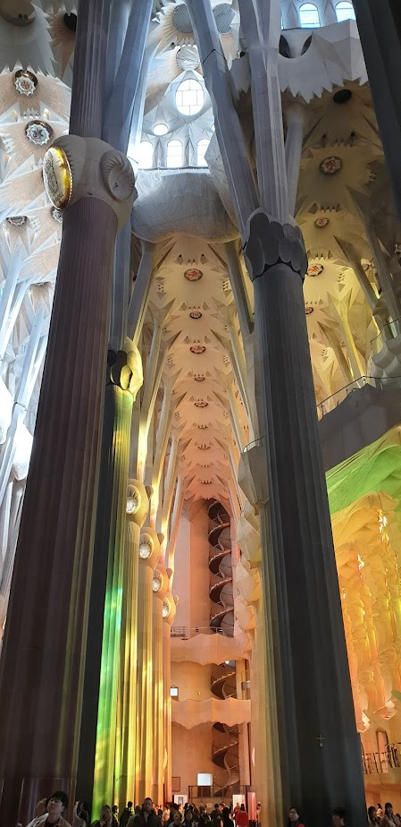 - 기존 성당과의 차별점: "숲"이라는 혁신적 아이디어 기존의 유럽 성당들은 대부분 육중한 기둥과 어두운 분위기로 엄숙하고 경건함을 강조합니다. 하지만 사그라다 파밀리아는 달랐습니다. 높이 솟은 기둥들은 마치 거대한 나무 줄기처럼 위로 뻗어 나가며, 천장에서는 나뭇가지처럼 여러 갈래로 갈라져 잎이 무성한 캐노피를 형성합니다. 그 모습은 마치 숲 속을 걷는 듯한 착각을 불러일으켰고, 저는 그 웅장함 속에서 한없이 작아지는 동시에, 자연의 경이로움과 건축의 아름다움에 깊이 감동했습니다.