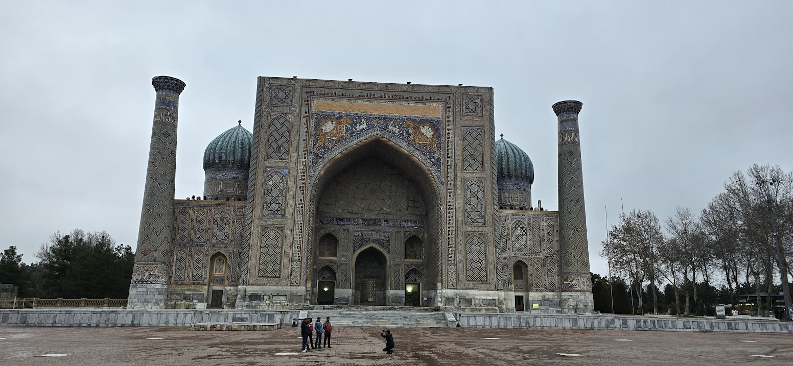 - 의미: '쉬르도르'는 "사자(호랑이)가 있는 문"이라는 뜻입니다. 울루그벡 메드레세가 지어진 지 200년 후, 야랑투쉬 바하두르(Yalangtush Bahodir)라는 인물이 맞은편에 대칭으로 건축했습니다.