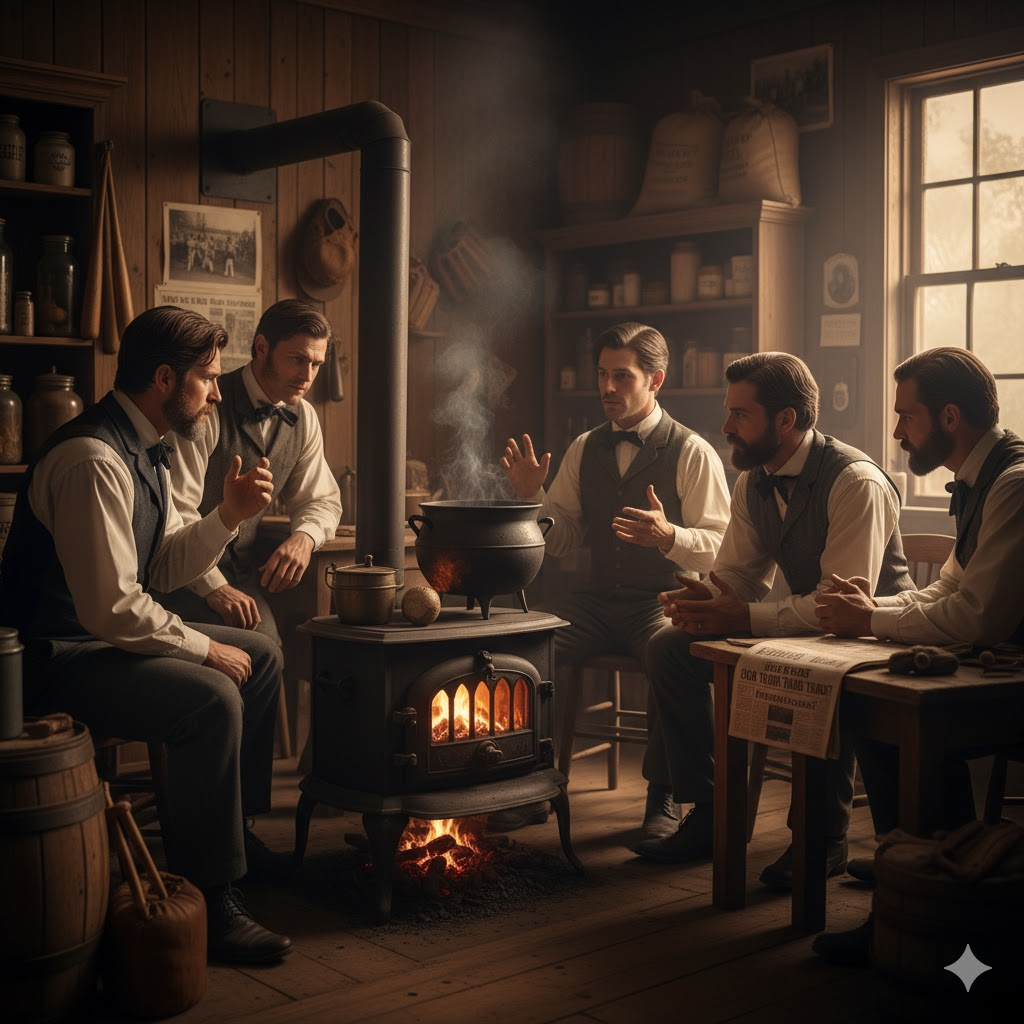 이 용어는 19세기 말 미국에서 유래했습니다. 당시 미국은 중앙 난방 시설이 흔치 않았기 때문에, 추운 겨울이 되면 마을 사람들이 잡화점이나 우체국 같은 공공장소에 놓인 쇠 난로(Pot-bellied stove) 주변에 모여 몸을 녹였습니다.