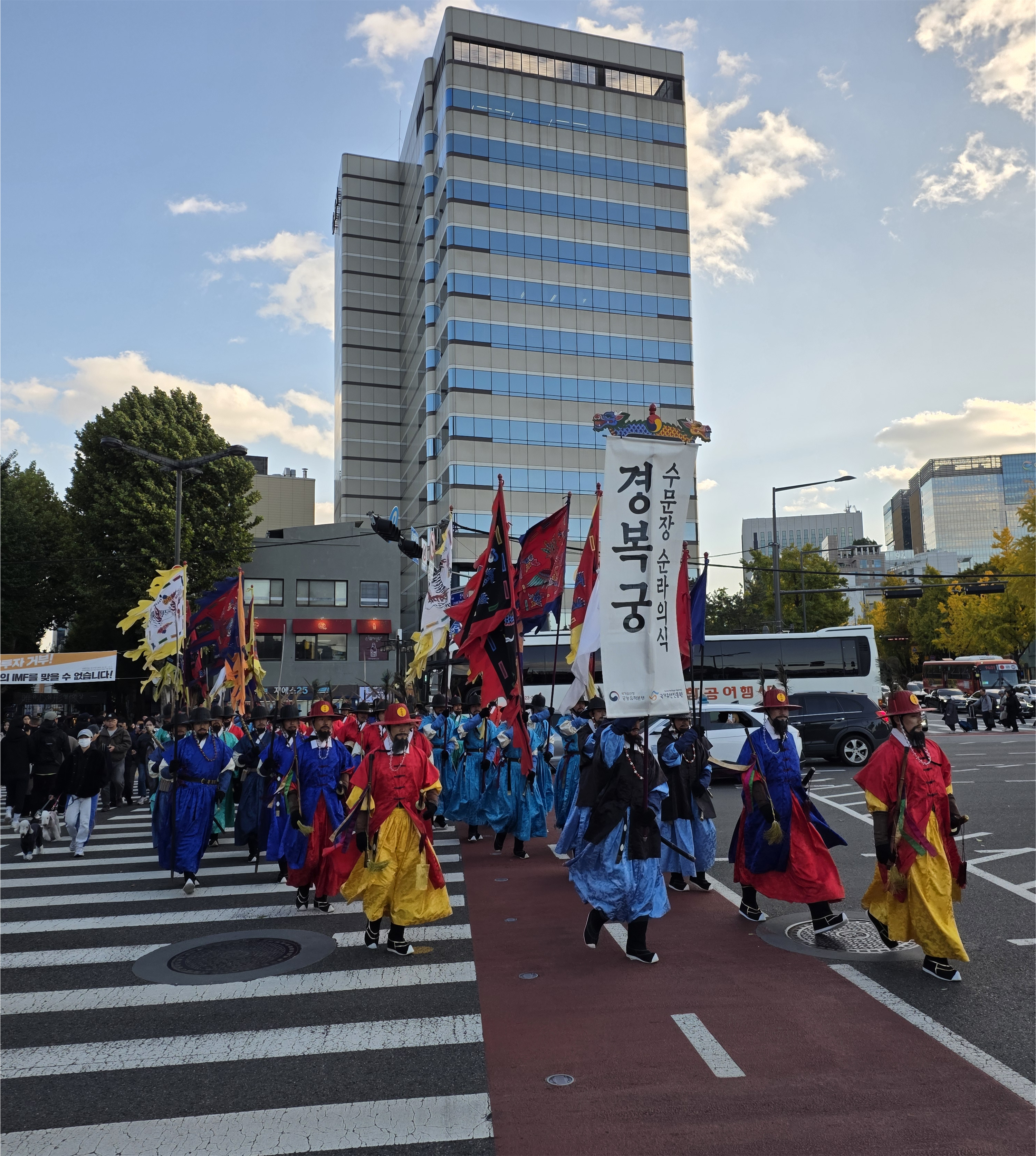 수문장 순라의식의 가장 큰 매력은 바로 '도심 속 시간 여행'입니다. 높고 현대적인 빌딩 숲 사이로 조선시대 군복을 입은 수문군들이 취타대의 우렁찬 전통 연주와 함께 행진하는 모습은 그야말로 이색적입니다.