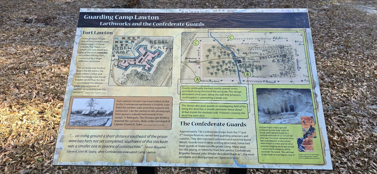 공원을 천천히 걸으며 자연을 즐기다 보면, 이곳이 단순한 휴양지 이상의 의미를 지니고 있다는 사실을 알게 됩니다. 1864년 이곳에는 ‘캠프 로튼(Camp Lawton)’이라는 남북전쟁 포로수용소가 설치되었습니다. 앤더슨빌 수용소의 포로 과밀 문제를 해결하기 위해 세워진 곳이었습니다. 얼마나 힘든 시간을 보냈을까 하는 생각이 들었습니다.